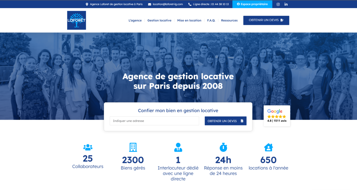 Laforêt LG est une agence immobilière spécialisée dans la gestion locative d’appartement sur Paris, membre du réseau Laforêt Immobilier, l’un des leaders du marché français. L’agence accompagne ses clients dans leurs projets de location et de gestion immobilière, en offrant une expertise locale et un service personnalisé.